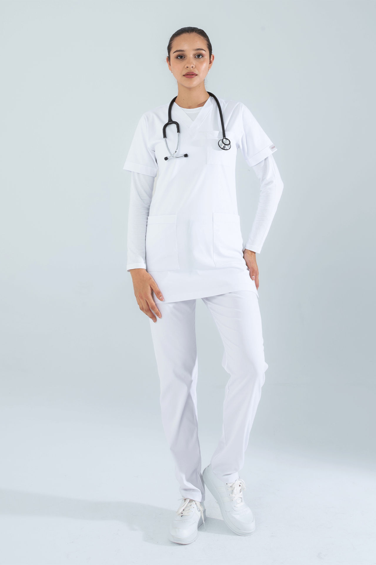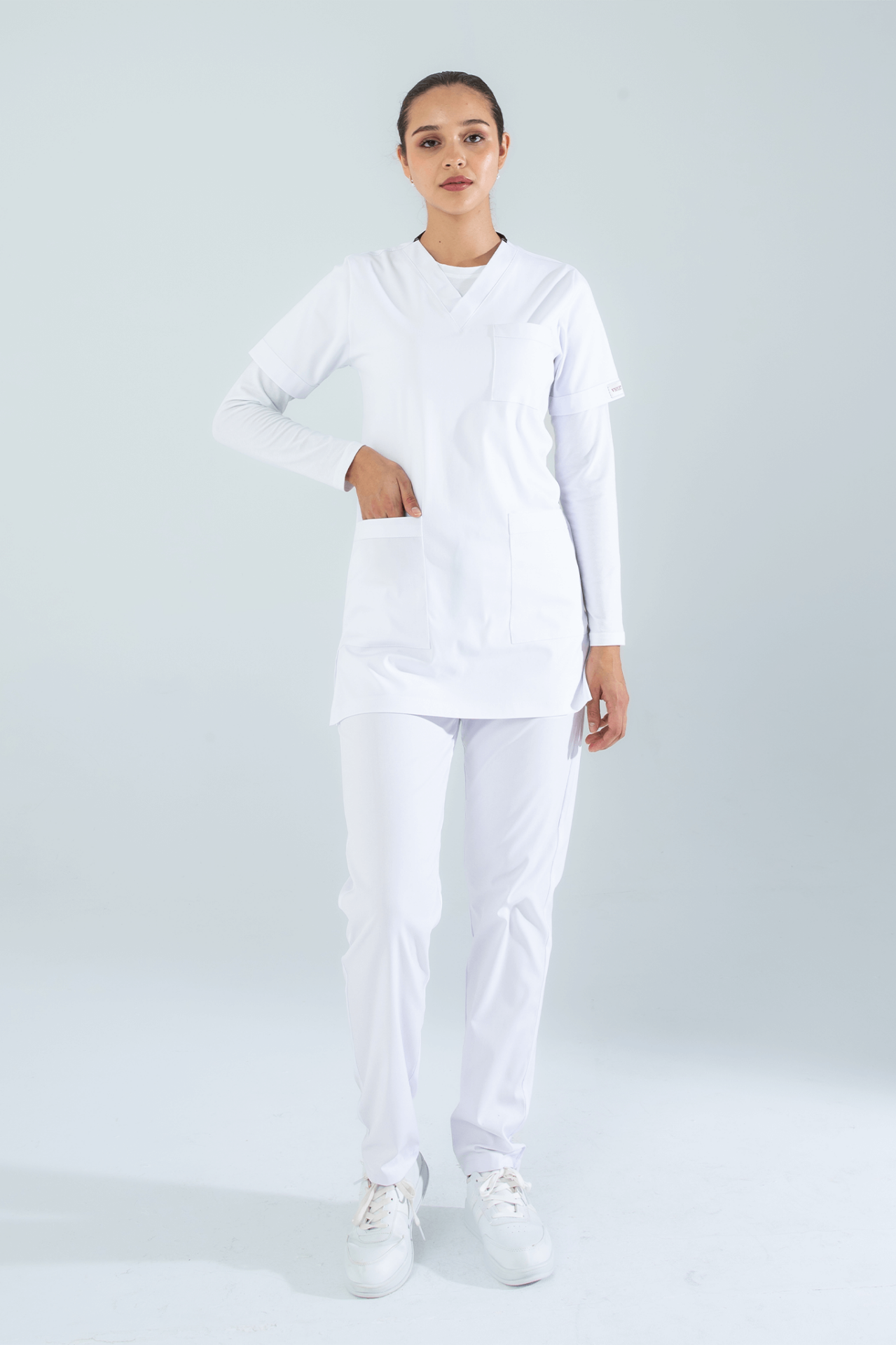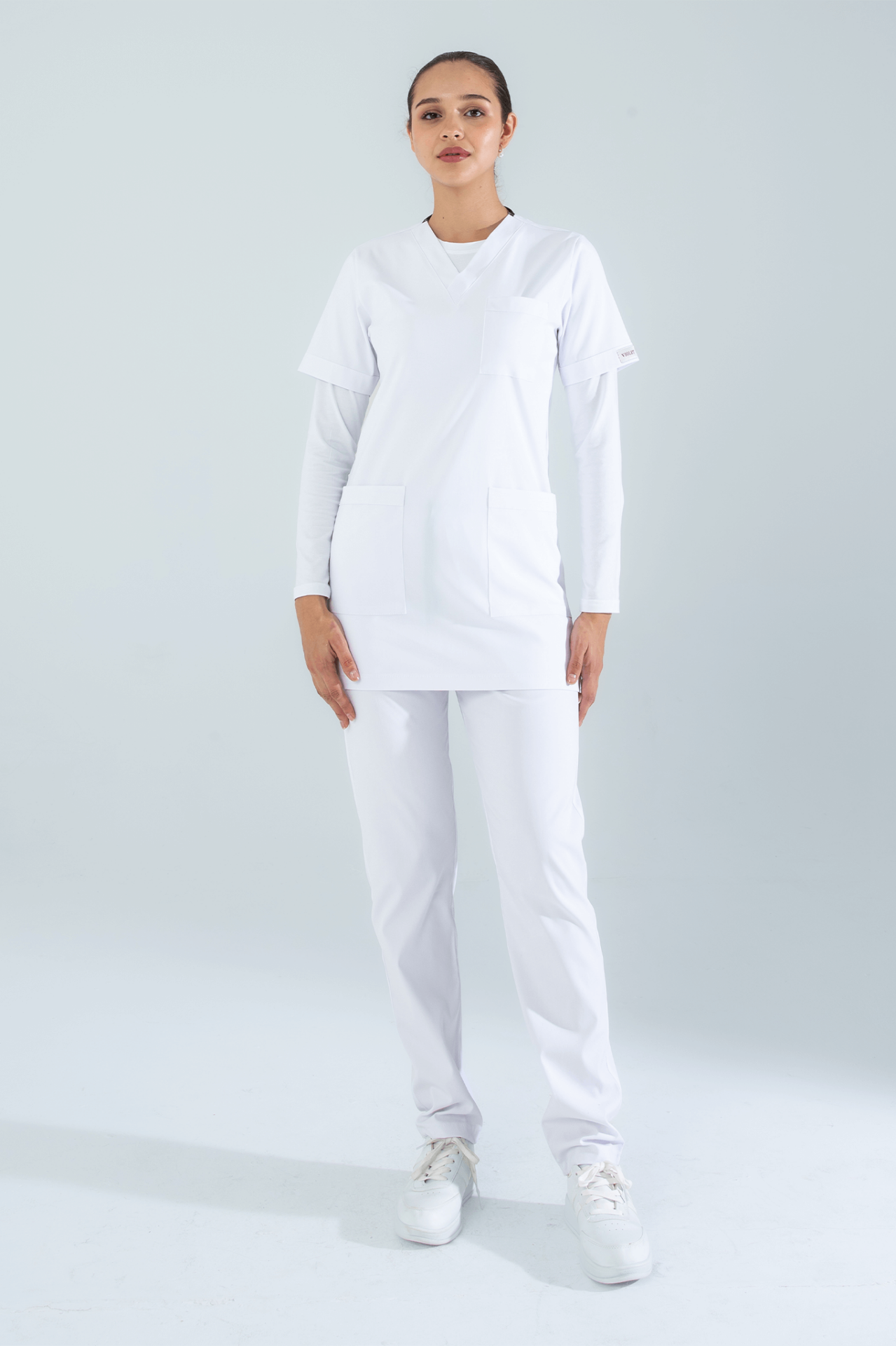 Üst Açıklama : V yaka tasarımıyla modern bir şıklık sunan Tunik forma üstü, bir göğüs cep ve iki alt cep ile pratik kullanım sağlar. Yan yırtmaç detayları hareket özgürlüğünü artırırken, Tunik boy kesimi rahatlık ve zarafeti bir arada sunar.
