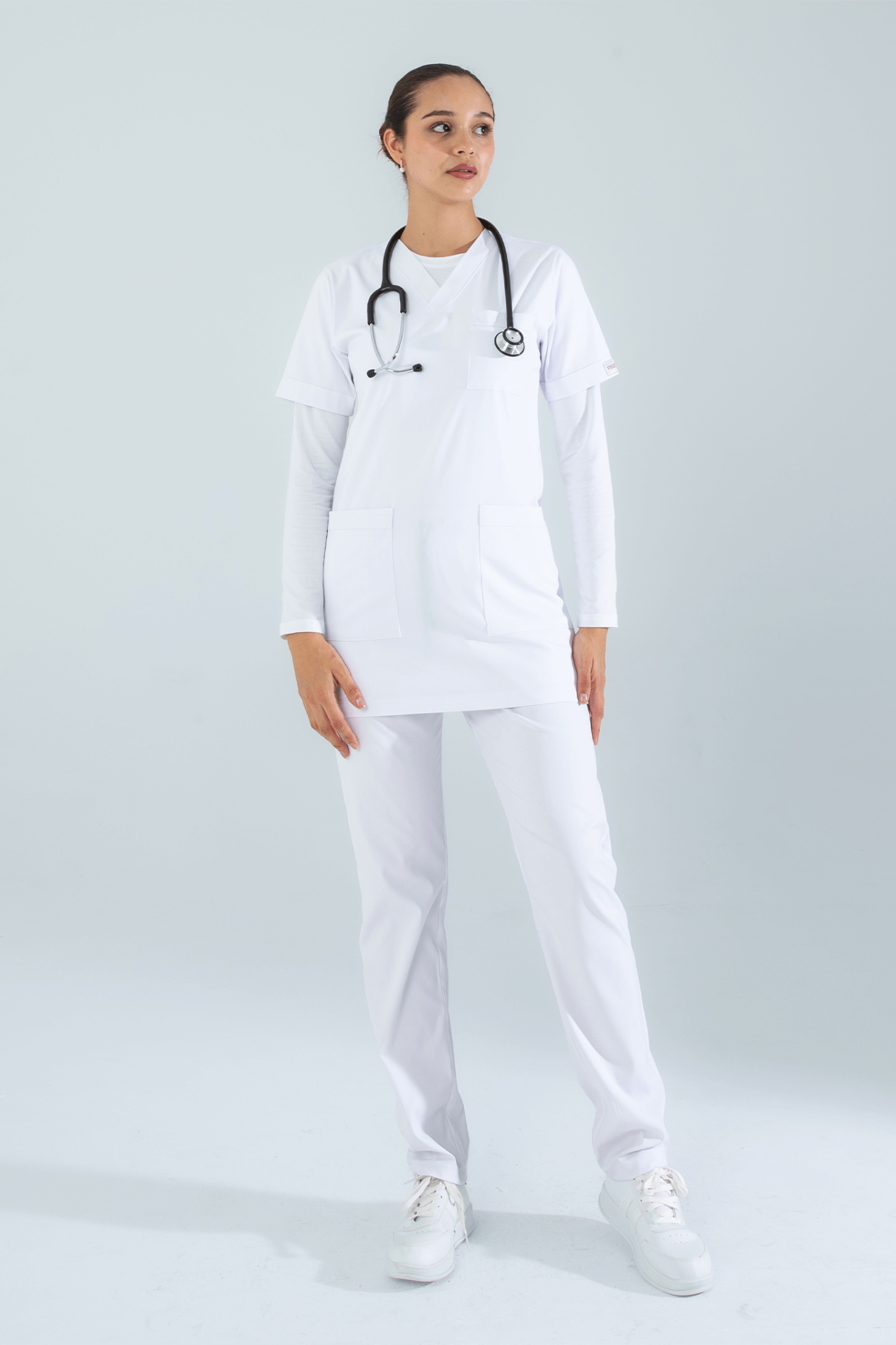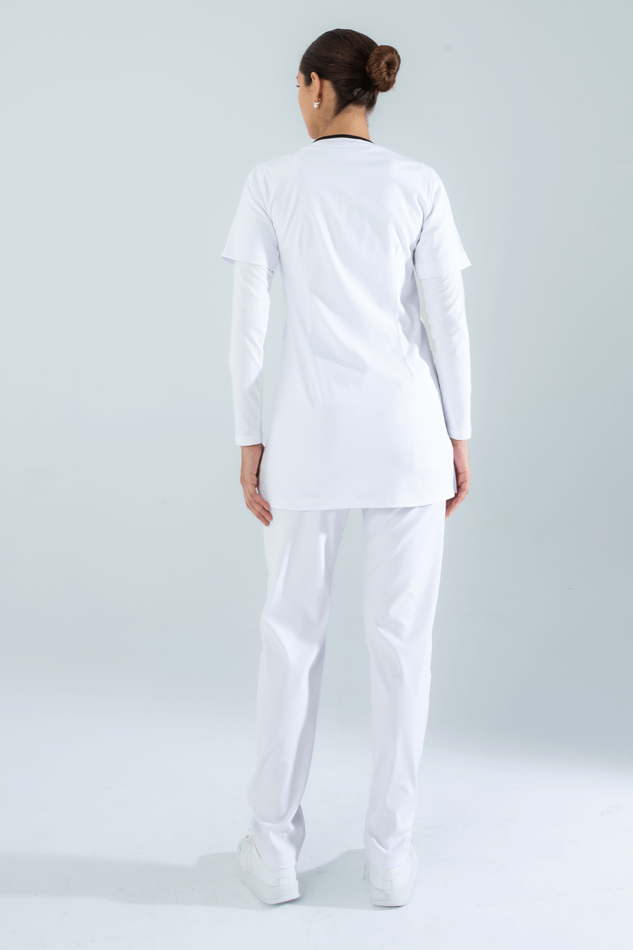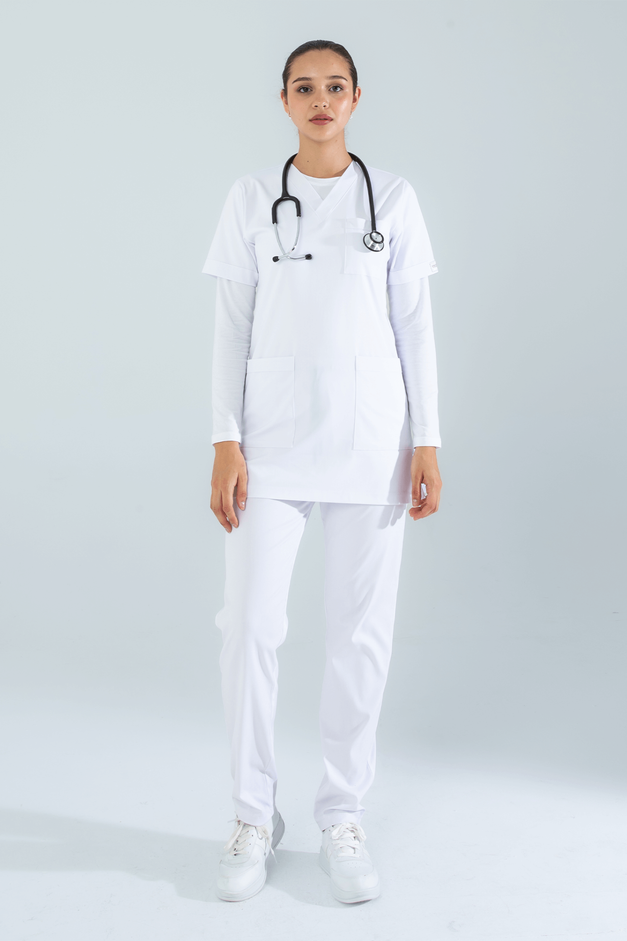 Üst Açıklama : V yaka tasarımıyla modern bir şıklık sunan Tunik forma üstü, bir göğüs cep ve iki alt cep ile pratik kullanım sağlar. Yan yırtmaç detayları hareket özgürlüğünü artırırken, Tunik boy kesimi rahatlık ve zarafeti bir arada sunar.